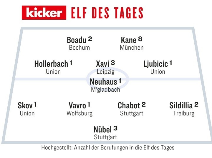 2月10日訊 德甲第21輪已經(jīng)完賽,《踢球者》評(píng)出了本輪德甲最佳陣容,凱恩領(lǐng)銜。