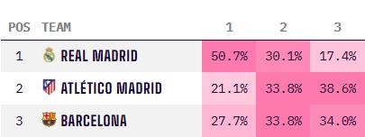 02月10日訊 西甲第23輪巴薩客場4-1力克塞維利亞,讓西甲三強爭冠形勢愈發(fā)懸念叢生。數(shù)據(jù)機構Opta最新的演算結果顯示,目前皇馬仍是西甲奪冠最大熱門,奪冠概率超過了50%,第二名馬競則只有21.%,巴薩則升至27.7%。Opta預測三強最終分差僅在一場球以內,皇馬季末預測積分為83分,巴薩80-81分,馬競80分。 本文標簽: 足球 西甲 皇家馬德里 巴塞羅那 馬德里競技