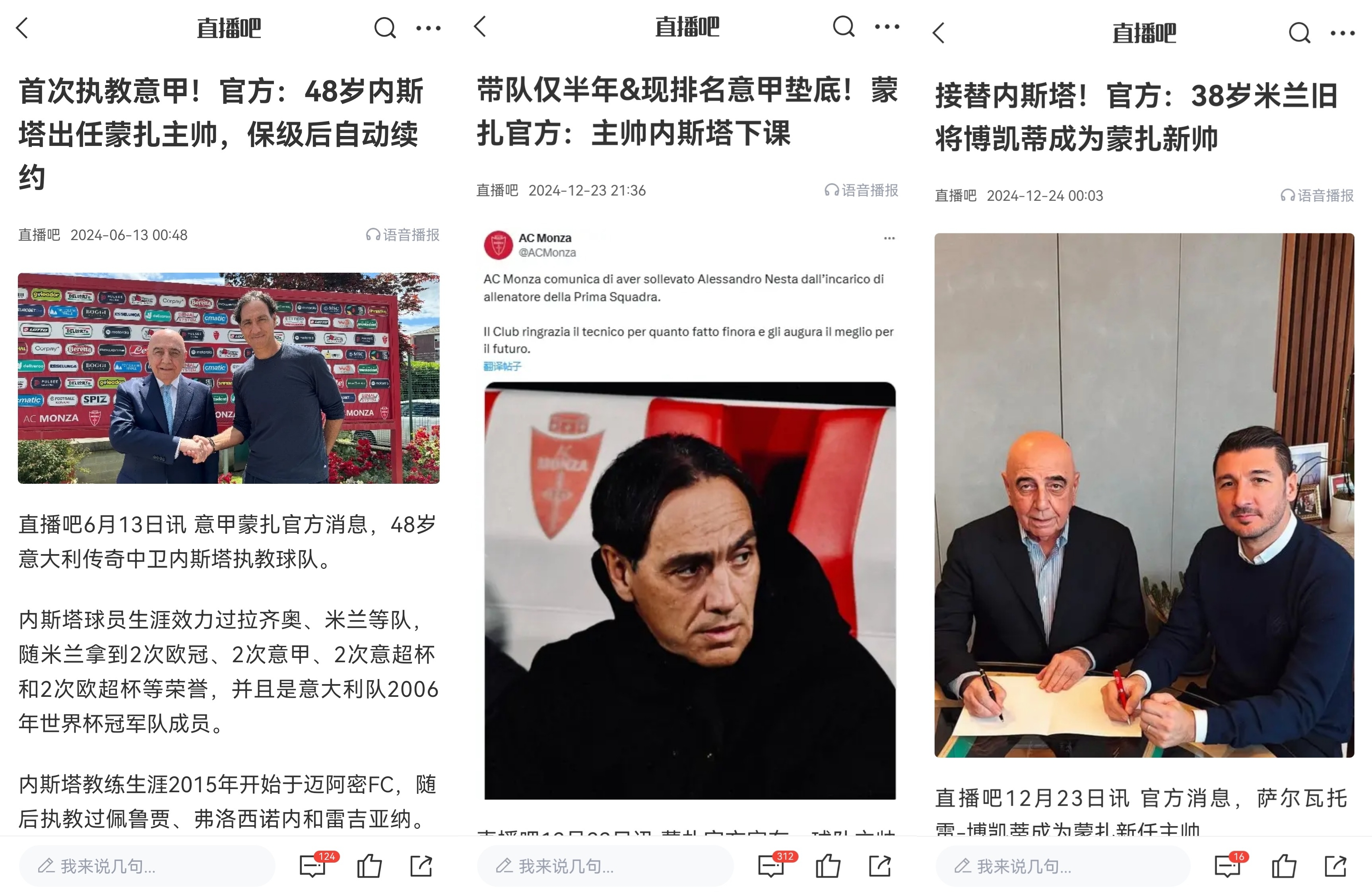 02月10日訊 意甲蒙扎官方宣布,解雇現(xiàn)主帥博凱蒂,再次任命48歲的內斯塔執(zhí)教球隊。