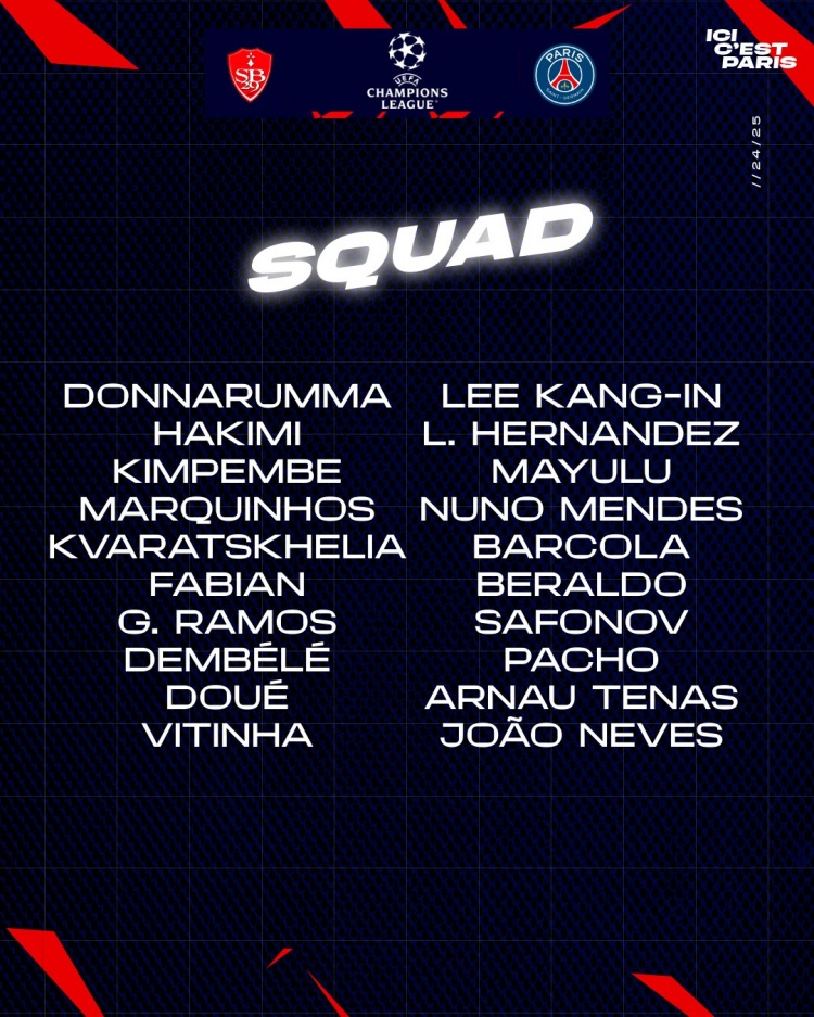 2月10日訊 北京時(shí)間2月12日凌晨,巴黎將在歐冠淘汰賽附加賽首回合比賽中客場對陣布雷斯特,巴黎公布了此役的球員名單,登貝萊、克瓦拉茨赫利亞、若昂-內(nèi)維斯在列,扎伊爾-埃梅里繼續(xù)缺席。