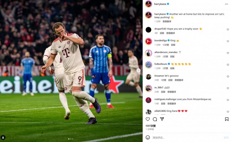 1月30日訊 在本輪歐冠,拜仁3-1擊敗布拉迪斯拉發(fā)。本場比賽凱恩破門得分,賽后凱恩也在個(gè)人社媒曬出本場慶祝進(jìn)球的照片,配文寫道:“又一個(gè)主場勝利,但是我們還有很多需要提升之處,讓我們繼續(xù)努力!” 本文標(biāo)簽: 足球 德甲 拜仁慕尼黑