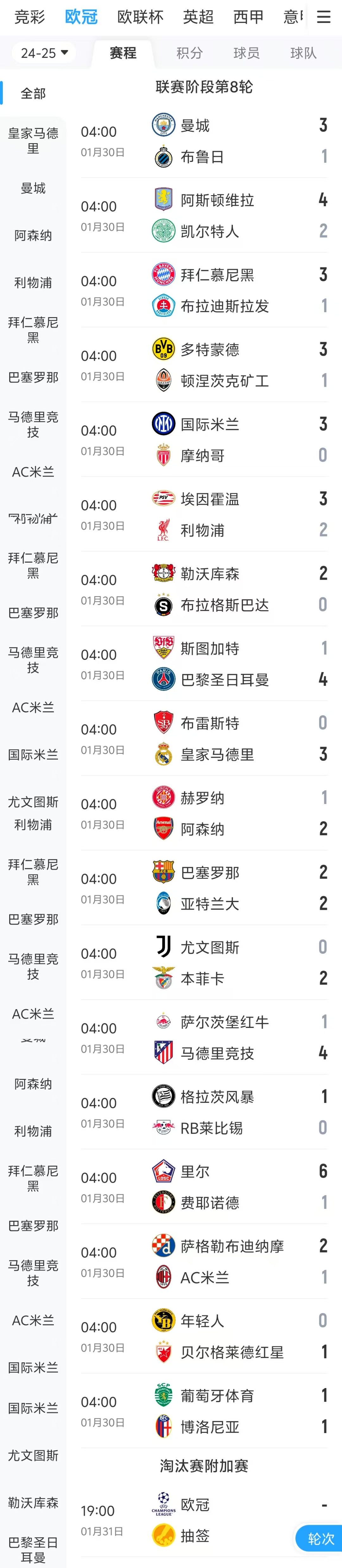 01月30日訊 北京時(shí)間1月30日星期四04:00,歐冠聯(lián)賽階段第8輪,18場(chǎng)比賽同時(shí)開打,歐冠聯(lián)賽階段收官戰(zhàn)綜述如下! 本文標(biāo)簽: 足球 西甲 英超 意甲 德甲 法甲 歐冠 皇家馬德里 馬德里競(jìng)技 切爾西 阿森納 曼城 利物浦 熱刺 AC米蘭 國(guó)際米蘭 尤文圖斯 那不勒斯 拜仁慕尼黑 多特蒙德 RB萊比錫 勒沃庫(kù)森 巴黎圣日耳曼 摩納哥 里昂 馬賽 亞特蘭大