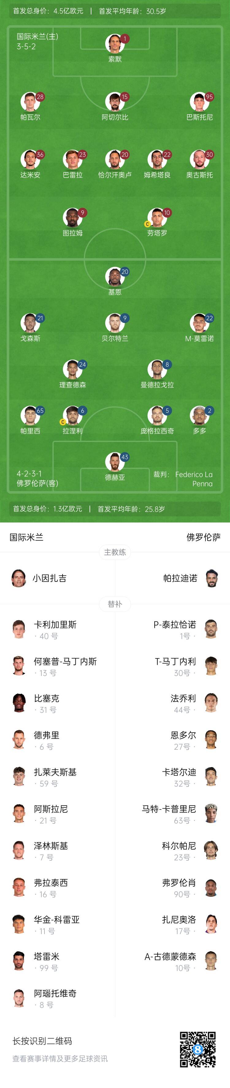 國米替補(bǔ):13-何塞普-馬丁內(nèi)斯、40-卡利加里斯、6-德弗里、7-澤林斯基、8-阿瑙托維奇、11-華金-科雷亞、16-弗拉泰西、21-阿斯拉尼、31-比塞克、59-扎萊夫斯基、99-塔雷米