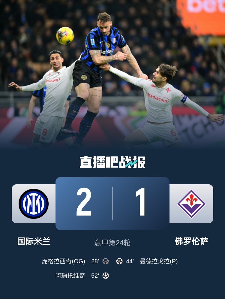 本輪意甲,國米2-1擊敗佛羅倫薩,勞塔羅造烏龍,阿瑙制勝。此役后國米距榜首1分。