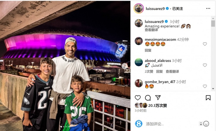 目前效力于邁阿密國(guó)際的蘇亞雷斯現(xiàn)場(chǎng)觀看了比賽,他在社交媒體上曬出與孩子在體育場(chǎng)外的合照,并配文:“很棒的體驗(yàn)?!?/p>