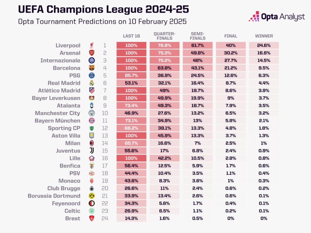 Opta大數(shù)據(jù)預(yù)測歐冠奪冠概率: