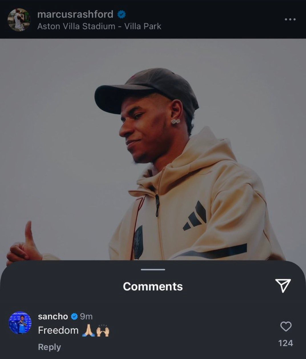 拉什福德冬窗租借離開曼聯(lián),而此前夏窗就已離隊的桑喬則在拉什福德社媒下回復稱其獲得“自由”。