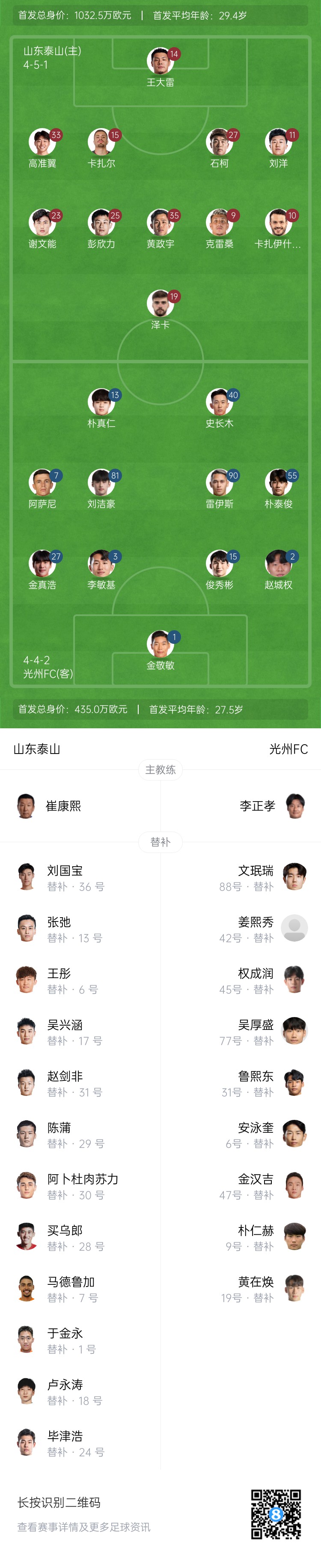 02月11日訊 北京時(shí)間今晚20點(diǎn),亞冠精英聯(lián)賽東亞區(qū)第7輪,山東泰山主場迎戰(zhàn)韓國球隊(duì)光州FC,賽前雙方公布首發(fā)陣容。