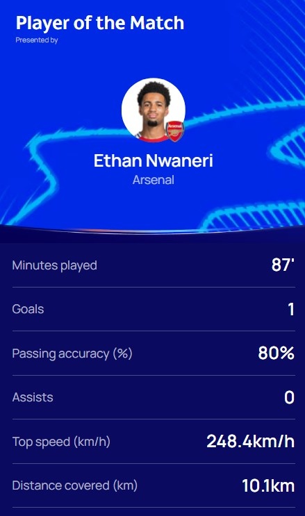 據(jù)歐足聯(lián)官網(wǎng)顯示,阿森納17歲小將恩瓦內(nèi)里當(dāng)選全場(chǎng)最佳,本場(chǎng)比賽他首發(fā)出戰(zhàn)87分鐘,打入一球,傳球成功率80%,跑動(dòng)距離10.1km。