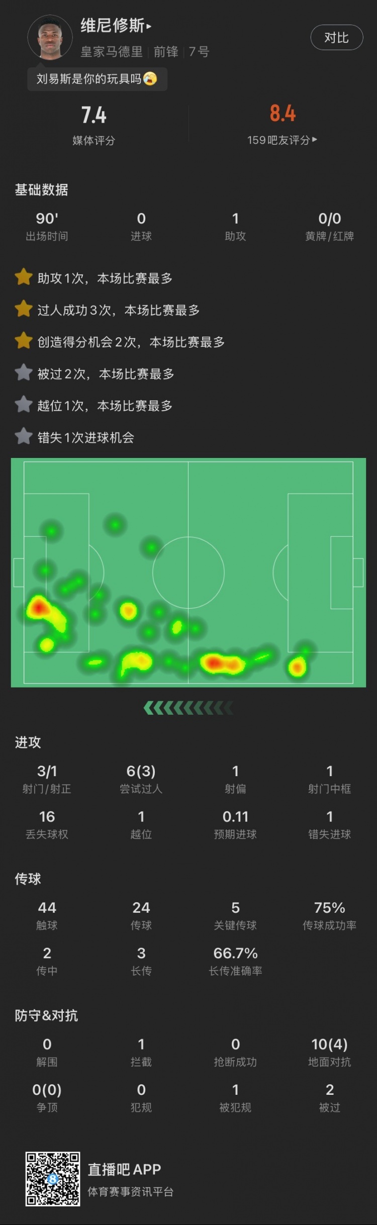 維尼修斯本場主要數(shù)據(jù)↓