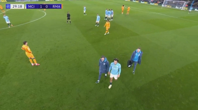 02月12日訊 曼城vs皇馬第30分鐘,格拉利什蹲在場上無法堅持了!隨即曼城調整,格拉利什下福登上!