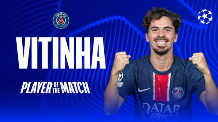 2月12日訊 歐冠淘汰賽階段的附加賽首回合,巴黎3-0完勝布雷斯特。賽后,維蒂尼亞當(dāng)選全場最佳球員。