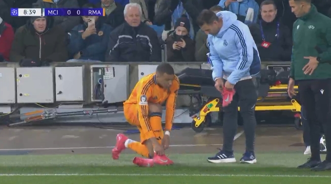 2月12日訊 歐冠淘汰賽附加賽首回合,曼城vs皇馬。比賽第9分鐘,姆巴佩的鞋帶被踩斷,跑到場(chǎng)邊更換球鞋。